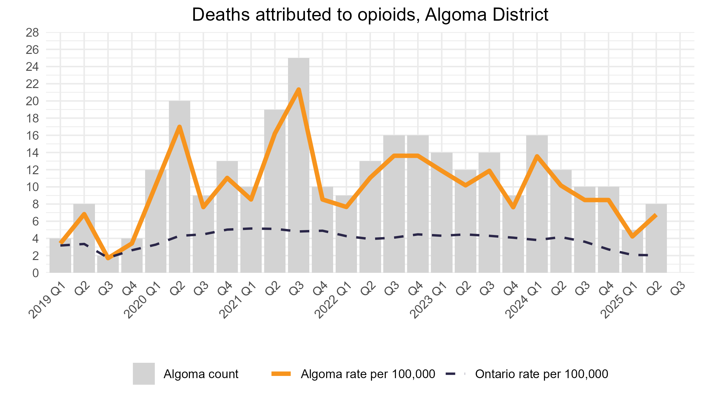 - The data includes opioid-related deaths for residents of Algoma District, and those that occurred in Algoma when the deceased did not have a fixed address.